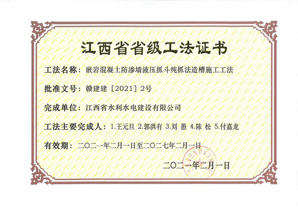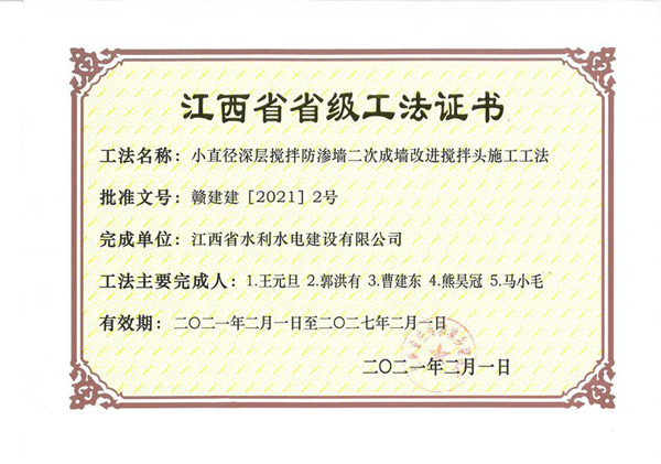 2021年2月1日,江西省住房和城乡建设厅文件《关于宣布我省2020年度第二批省级工程建设工法的通知》(赣建建〔2021〕2号)宣布了2021年度第二批省级工程建设工法评审效果,其中,公司申报的《小直径深层搅拌防渗墙二次成墙刷新搅拌头施工工法》、《嵌岩混凝土防渗墙液压抓斗纯抓发造槽施工工法》审定为“2020年度省级工程建设工法”。