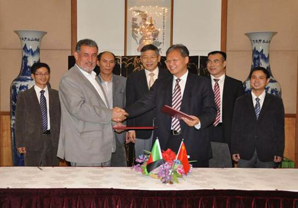 徐飞洪大使(右三)与阿方能源水利部水务司长穆罕穆迪(左二)交流移交证书