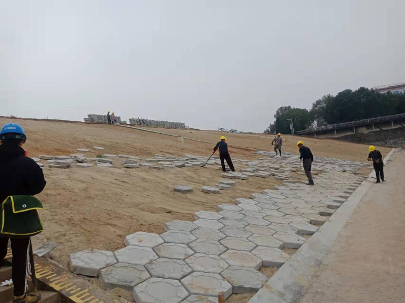 东一副坝上游坝坡预制块施工
