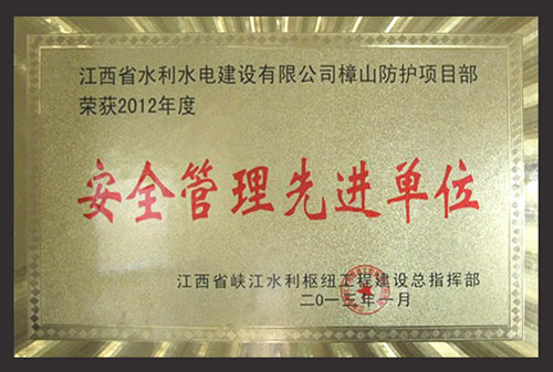 2013年2月,江西省峡AG手机版官网利枢纽工程建设总指挥部授予我公司樟山防护工程项目部“2012年度清静治理先进单位”声誉称呼,项目治理职员彭红军、邓敏被评为峡AG手机版官网利枢纽“清静生产先进小我私家”。