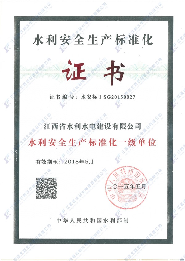 我公司获“水利清静生产标准化一级单位”证书