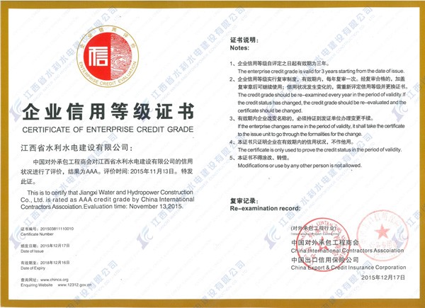 凭证商务部、国资委团结宣布的《商会协会行业信用建设事情指导意见》和《关于进一步做好行业信用评价事情的意见》的要求,团结承包商会关于推选行业信用系统建设的事情安排,承包商会于2015年7月启动2015年度对外承包工程企业与劳务相助企业信用品级评价事情,经对外承包工程企业与劳务相助企业信用品级评审委员会第十一次事情聚会审议,江西省水利水电建设有限公司被评定为2015年度对外承包工程企业信用评价AAA级信用企业。