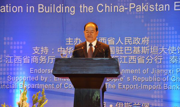 2017年4月20日 ,由江西省人民政府主理 ,中华人民共和国驻巴基斯坦大使馆支持 ,江西省商务厅、中国收支口银行江西省分行等承办的“央企-赣企相助建设中巴经济走廊恳谈会”在巴基斯坦首都伊斯兰堡召开 ,中共江西省委书记、江西省人大常委会主任鹿心社应邀出席聚会并致辞 。