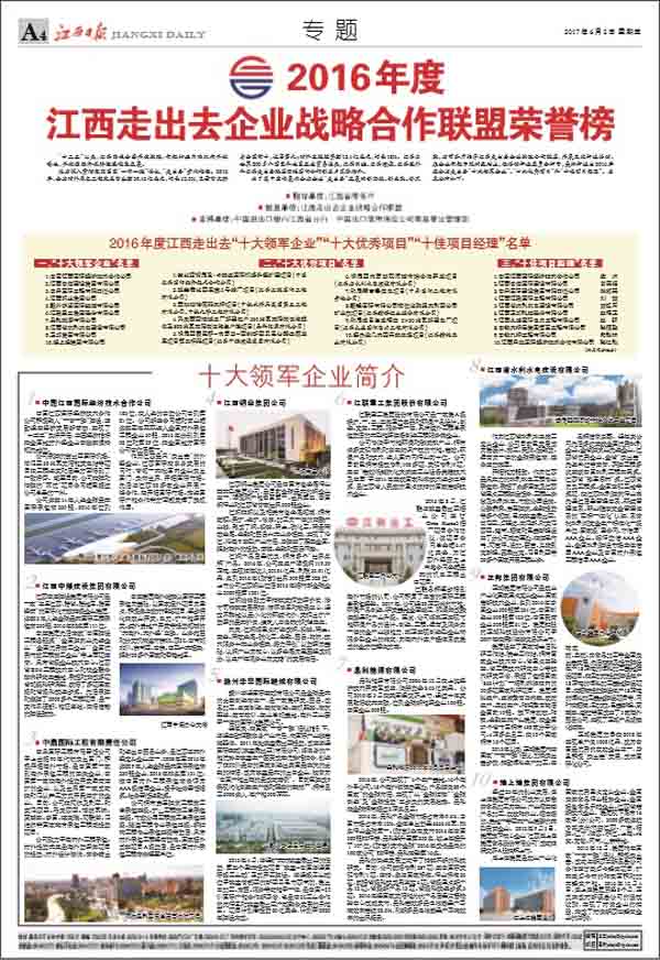 6月3日,江西走出去企业战略相助同盟2017年大会在南昌召开。省委常委、常务副省长毛伟明出席大会并作主要讲话,会上省委常委、常务副省长毛伟明、省政府秘书长王亚联和省商务厅厅长王水平划分为2016年度全省走出去“十大领军企业”、“十大优异项目”和“十佳项目司理”授牌。江西走出去企业战略相助同盟轮值主席、中国江西国际经济手艺相助公司总司理徐国建报告了2016年岁情,国家开发银行江西分行、中国收支口银行江西省分行和中国出口信用包管公司南昌营管部作为同盟副主席单位讲话。公司董事长王元旦作为十大优异项目的企业代表讲话。《江西日报》、《江西卫视》相继对大会举行了大幅报道。
