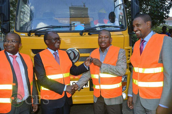 总督Mike Sonko及内罗毕交通局部长James Wainaina Macharia在清污车前合影(左2为部长James,右2为总督Mike Sonka)