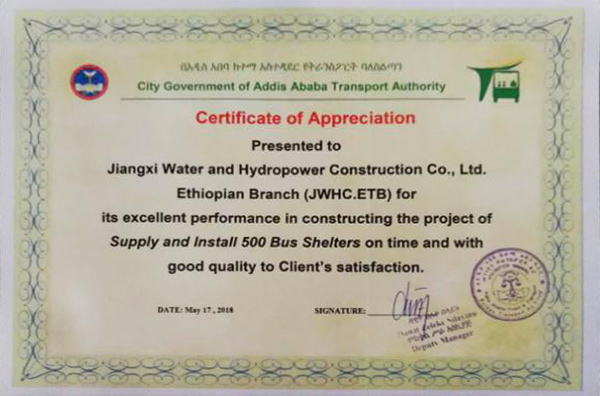 克日,埃塞有限公司收到亚的斯亚贝巴市交通局揭晓的谢谢证书,表扬公司在承建亚的斯亚贝巴市500套公交候车亭供货与装置项目上体现优异 。