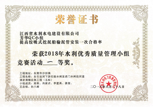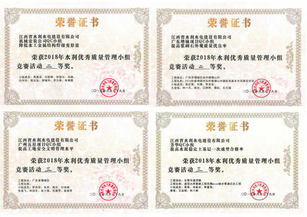 近年来,公司注重质量治理立异,起劲开展QC效果和手艺攻关运动,工程质量治理水平和企业立异能力一直提升,已一连四年荣获水利优异质量治理小组竞赛运动奖项。