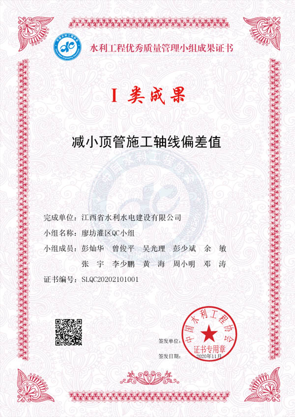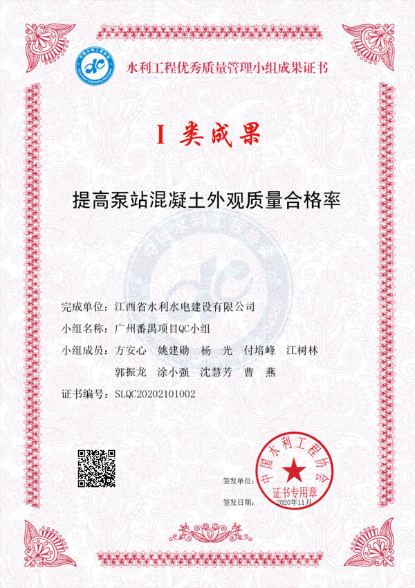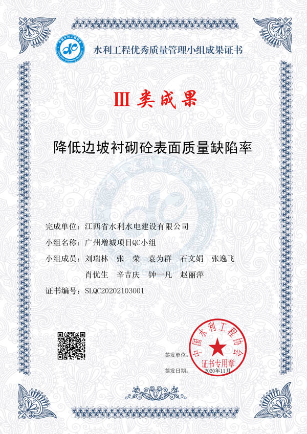 其中:廖坊灌区QC小组编写的《减小顶管施工轴线误差值》获I类效果奖、广州番禺项目QC小组编写的《提高泵站混凝土外观质量及格率》获I类效果奖、广州增城项目QC小组编写的《降低边坡衬砌砼外貌质量缺陷率》获III类效果奖。