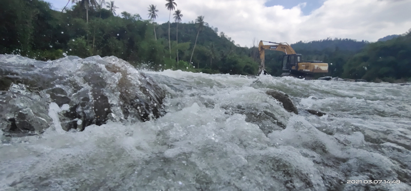文字说明;该照片是在伯恩河中用手机拍摄 ,是印尼疫情复工后开发新施工蹊径时的场景。在奔腾的洪流中急流拍石 ,浪花飞溅 ,挖机迎难而上 ,象征着公司坚韧不平的品质、水建人大无畏的事情热情。对岸的满山绿树在蓝天白云下 ,勾勒出一幅壮丽的画面 ,预示着伯恩电站的优美未来 ,高高的椰子树 ,象征着集团公司绚烂的明天!